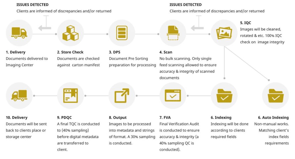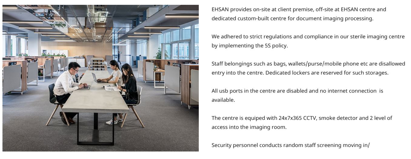 EHSAN provides on-site at client premise, off-site at EHSAN centre and dedicated custom-built centre for document imaging processing. We adhered to strict regulations and compliance in our sterile imaging centre by implementing the 5S policy. Staff belongings such as bags, wallets/purse/mobile phone etc are disallowed entry into the centre. Dedicated lockers are reserved for such storages. All usb ports in the centre are disabled and no internet connection is available. The centre is equipped with 24x7x365 CCTV, smoke detector and 2 level of access into the imaging room. Security personnel conducts random staff screening moving in/ |