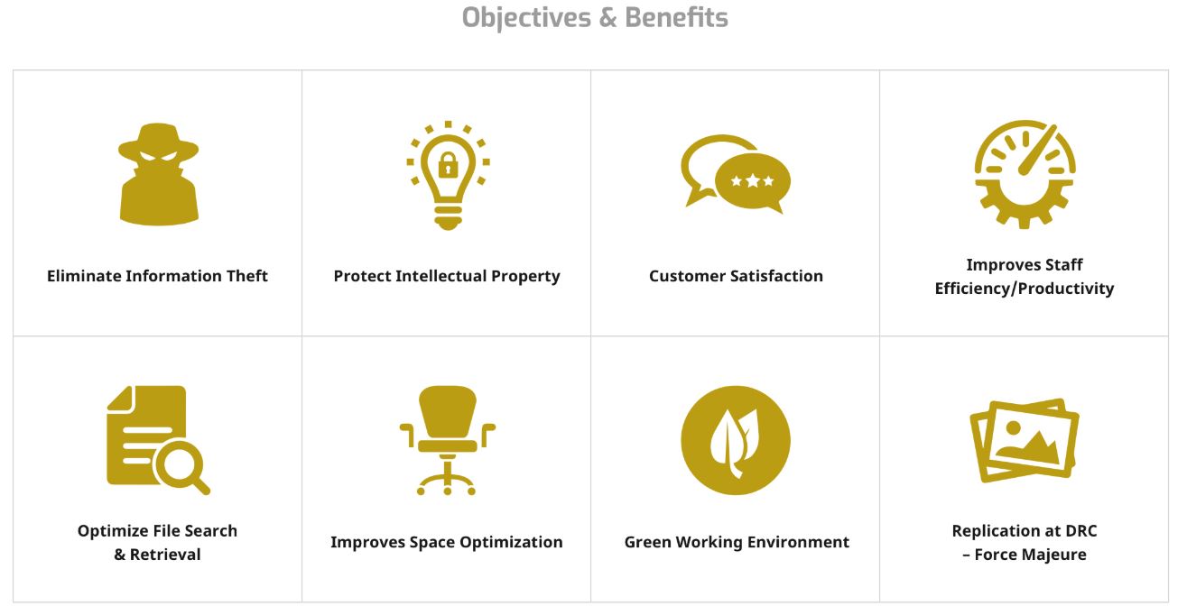 Storing and replicating of their digital information in other locations in DRC or secondary storage are still lacking and overlooked. Digitilization facilitates the organization’s most valuable assets by converting data in paper such as texts, images, schematic drawings and books into digital formats with high quality and searchable files that can be accessed instantaneously through indexing values as key search and OCR (Optical Character Recognition) for split-second searches. These digital information and data stored or replicated in their DRC can be instantaneously replicated and duplicate into their storage to avoid any loss of businesses when mishap occurs.